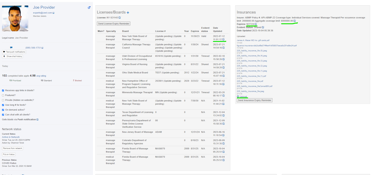 Providers are required to keep an up-to-date MT License and Insurance policy. If we need to upload new credentials for a provider that can be done from their profile.