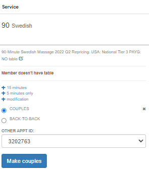 To do so, click the Couples/B2B button below the duration summary and select either Back-to-Back or Couples and enter the Appointment ID of the other appointment.