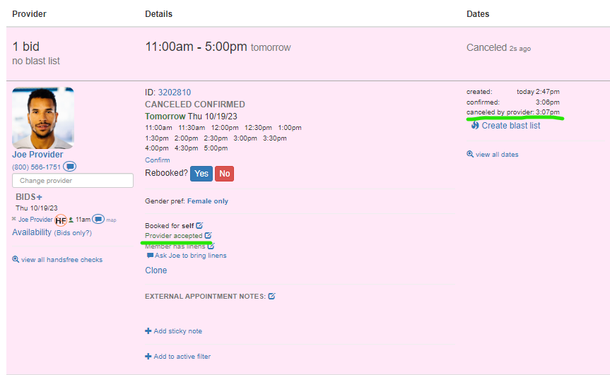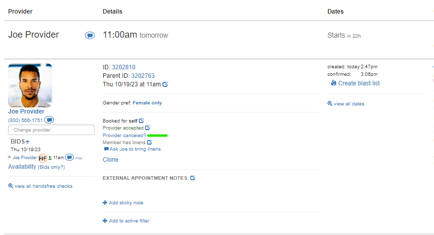 If we need to cancel an appointment for a provider (non-medical) we can use the "Provider Canceled?" button below the Appointment ID.