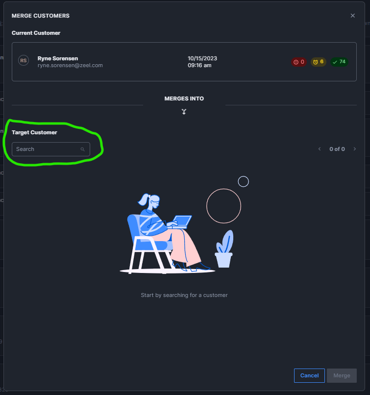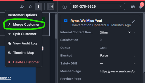 If a client or provider has two (or more) Kustomer profiles, we can merge the profiles by clicking "Merge Customer" on profile 1 and entering the email or phone associated with profile 2.